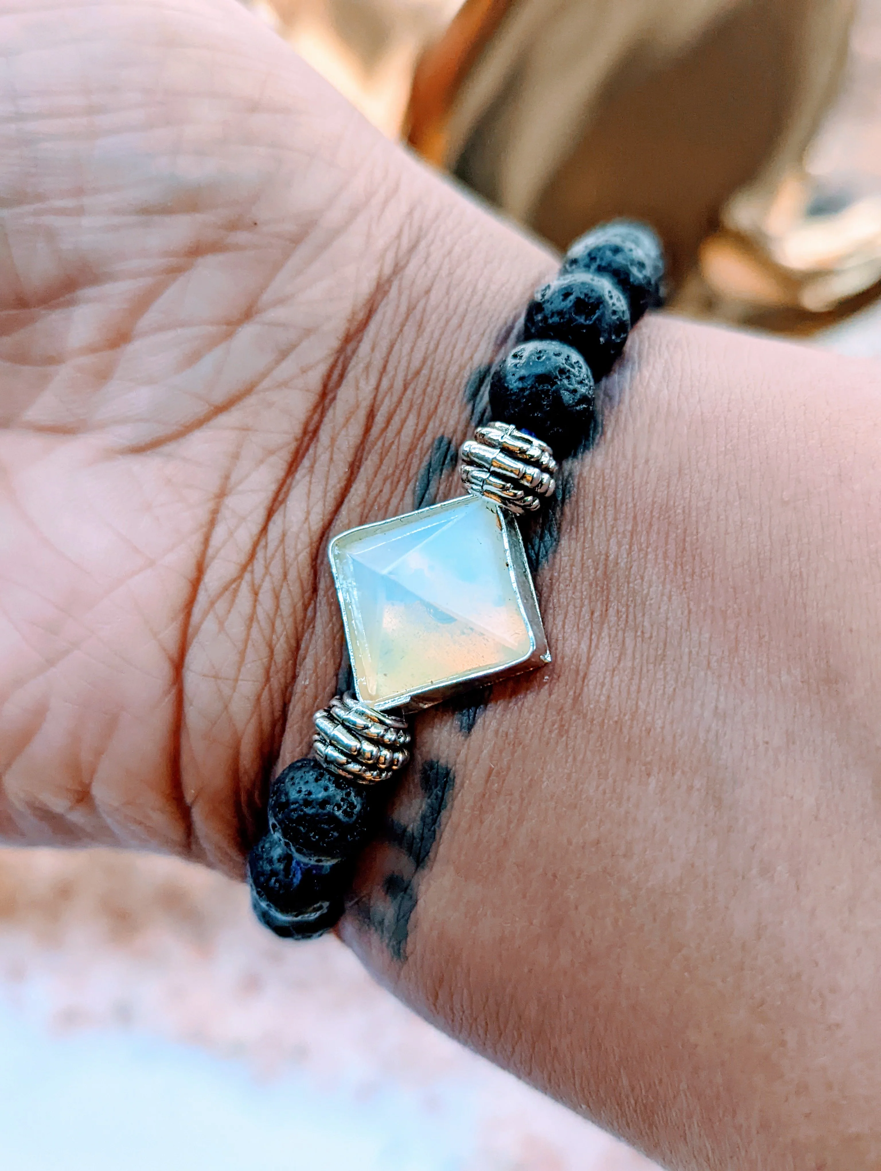 Spiritual properties and uses: The combination of opalite and lava are the perfect stones for new beginnings. The earth and fire energy from the lava stone pair well with the Water and Air energies of the opalite crystal creating an achemial balance ripe for transformation.